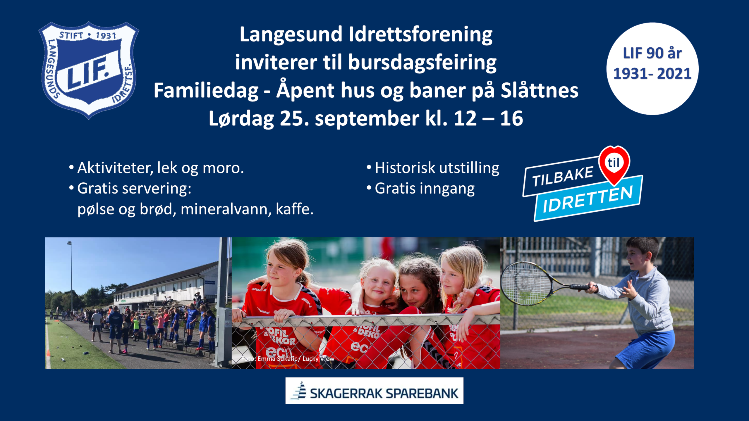 Langesund Idrettsforening inviterer til bursdagsfeiring med Familiedag - Åpent hus og baner på Slåttnes Lørdag 25.september 2021 kl. 12-16 Aktiviteter, lek og moroGratis servering: pølse og brød, mineralvann, kaffe&n
